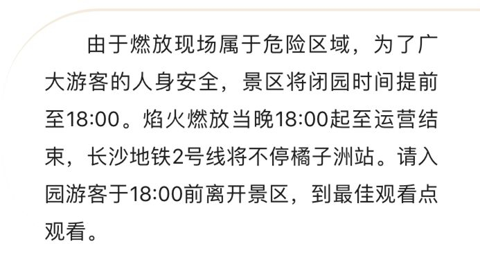 橘子洲焰火逢重大节日燃放,届时城区交通流叠加,市民现场观看应提前做好准备,尽量选择乘坐公共交通工具,横道时请遵守交通信号,不要抢道抢行,确保自身安全。机动车行经相关道路应提前做好出行安排,请绕开中心现场及周边区域道路,经过人流密集区域时请减速慢行,避让行人。