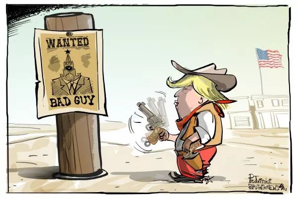▲【寻找目标】打扮成牛仔模样的美国总统特朗普玩弄着手枪,前方的柱子上张贴着“坏蛋通缉令”。2018年1月,美国财政部向国会提交一份普京身边亲密人士的“黑名单”。(俄罗斯卫星网)