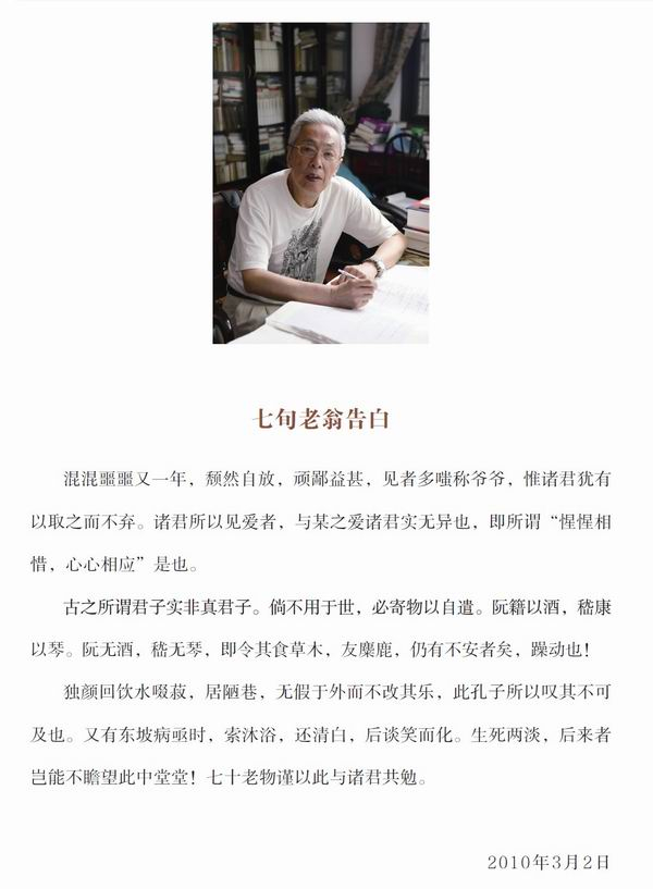 十八世纪法国作家布丰的名言“风格即人本身”(Le style c’est l’homme même),当然也适用于陆老师的文字。读着这个集子,尤其是那些出自他一度亲笔经营的博客的“博文”,常常使我想起多年来每次相聚时,他言笑晏晏、咳珠唾玉的情景来。在布封之后,下一个世纪的法国作家福楼拜别出心裁,在给一位友人的书信中说:“风格就是生活!她正是思想的生命线!”(Le style c’est la vie! c’est la sang mȇme de la pensée!)我以为福楼拜的这个说法,特别适用于陆老师的作品,因为他虽然好静,却从来不是离群索居于象牙塔中的隐士,而是一位紧接地气的“性情中人”。《三集》中的“故人旧事”“世间百态”这两个压轴的部分,字里行间,反映了他那种“位卑未敢忘忧国”“一枝一叶总关情”的坦荡心地和博大胸怀,也充分表现了他那个写得端端正正的斗大的“人”字。