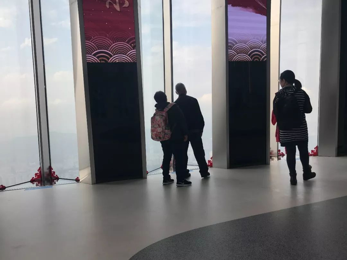观光层每个转角处都设置有一个三角形的玻璃地板,让你感受什么是悬浮在高空。