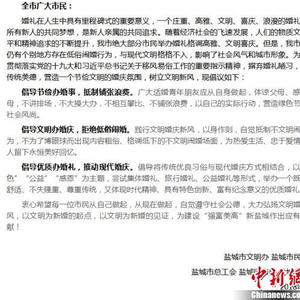 盐城市《文明婚礼、抵制低俗》倡议书。截图