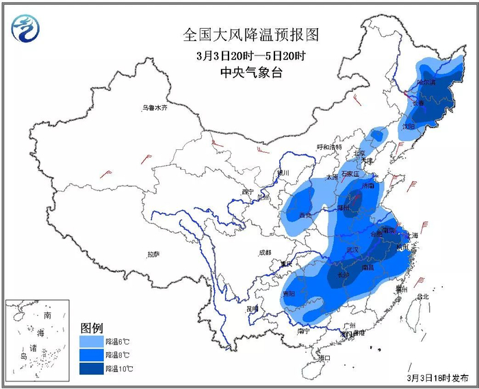 中央气象台预计,3日晚间至5日,冷空气自西向东将影响我国中东部地区。受其影响,东北地区大部、华北中南部、黄淮、江淮、江南中北部等地有6~8℃降温,部分地区降温可达10℃以上。