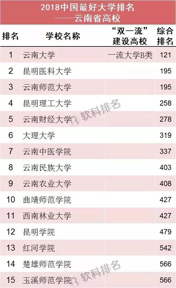 云南共有15所高校上榜