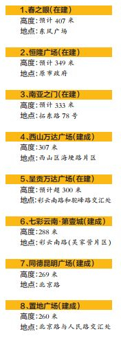 控高后昆明在建摩天楼会不会变矮《关于加强城市空间管控和特色风貌塑造的指导意见》,对昆明市各区域的制高点作了明确规定,包括东风广场、呈贡等地。根据媒体报道,昆明当前8大摩天楼也主要在这些区域,而其中不少仍是在建状态,例如建成后将成为昆明第一、第二高楼的春之眼、恒隆广场。指导意见出台后,昆明的摩天楼会因此变矮吗?