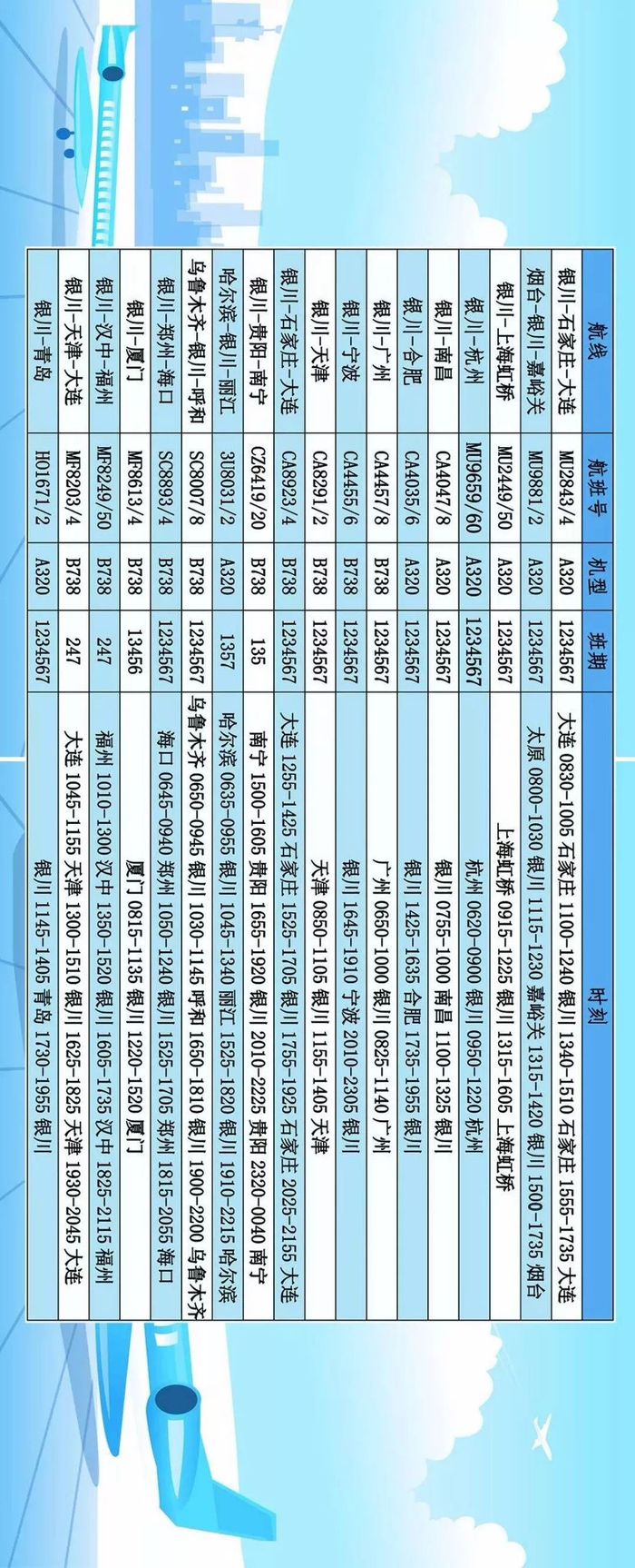银川-宁波直飞航线,银川起飞时间为下午16:45,19:10到达宁波,20:10宁波起飞,23:05抵达银川。