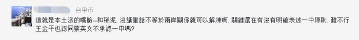 有网友一针见血指出,“这就是本土派的嘴脸——和稀泥。没讲重话不等于两岸关系就可以解冻啊。关键还在有没有明确表述一中原则。”并质问“难不行王金平也认同蔡英文不承认一中吗?”