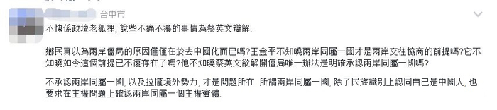 还有网友批评其尽“说些不痛不痒的事情为蔡英文辩解”。网友指出,乡民真以为两岸僵局的原因仅仅在于“去中国化”而已吗?王金平不知晓两岸同属一国才是两岸交往协商的前提吗?它不知晓如今这个前提已不复存在了吗?他不知晓蔡英文欲解开僵局唯一办法是明确承认两岸同属一国吗?