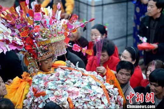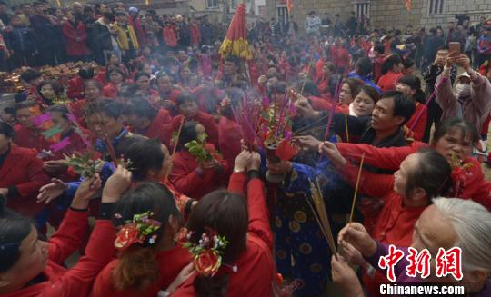 中新网福建湄洲岛3月4日电(林春茵 林春盛)“海上保护女神”妈祖今年将迎来圣诞1058周年。在妈祖故里福建湄洲岛,千岁妈祖享受着最长的元宵节:从农历正月初六到二月初二,湄洲岛一直是热热闹闹的,挂脰、游灯、摆棕轿、猜灯谜、乩童吃花,“让妈祖开心”。