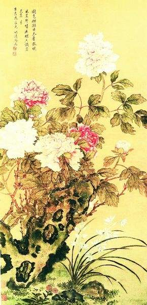 清代马逸作品《国色天香图》,图中牡丹盛开,旁边还有兰花一丛。