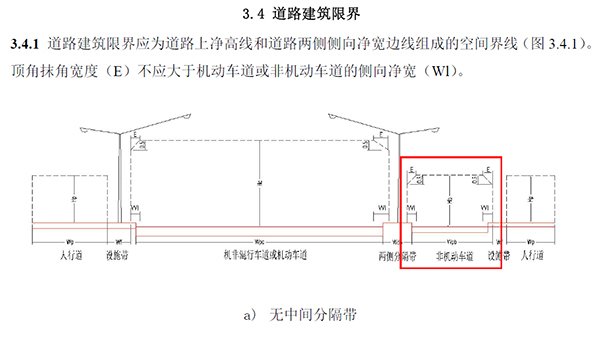 《城市道路工程设计规范》(CJJ37-2012)的第3.4条“道路建筑限界”图示。无论行车道、非机动车道还是人行道,均有明确的建筑限界,并强制性要求,不得有任何物体侵入。