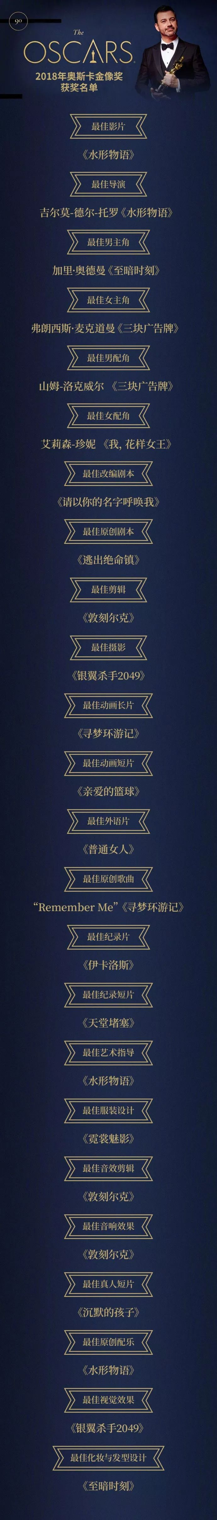 第90届奥斯卡奖颁奖典礼昨日在洛杉矶杜比剧院举行,奇幻剧情片《水形物语》一举夺得4个奖项,包括最佳影片奖和最佳导演奖两个重要奖项,成本届金像奖最大赢家。加里·奥德曼和弗兰西斯·麦克多蒙德分别凭借《至暗时刻》和《三块广告牌》加冕影帝影后。最佳导演奖颁给了《水形物语》的导演吉尔莫·德尔·托罗。《水形物语》还获得最佳原创配乐奖和最佳艺术指导奖。(环球时报)