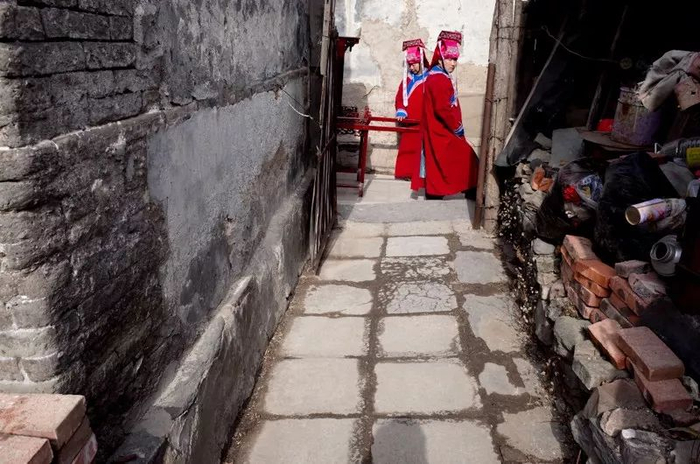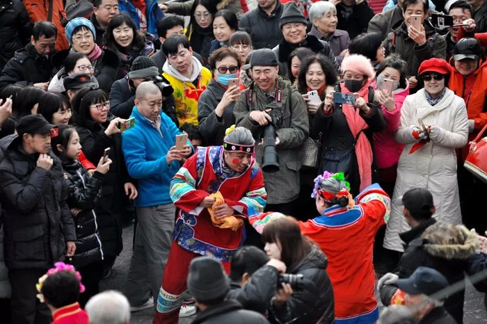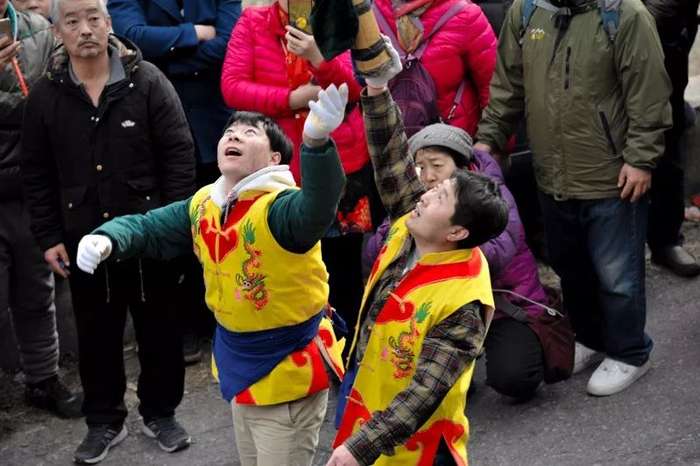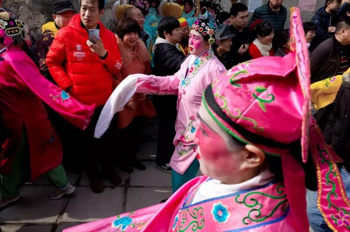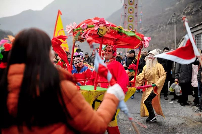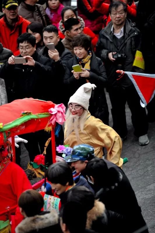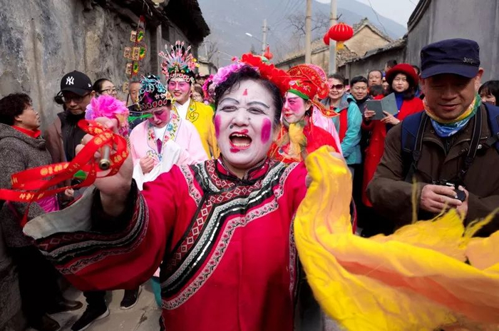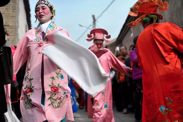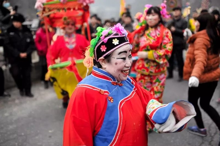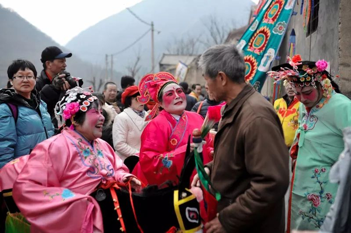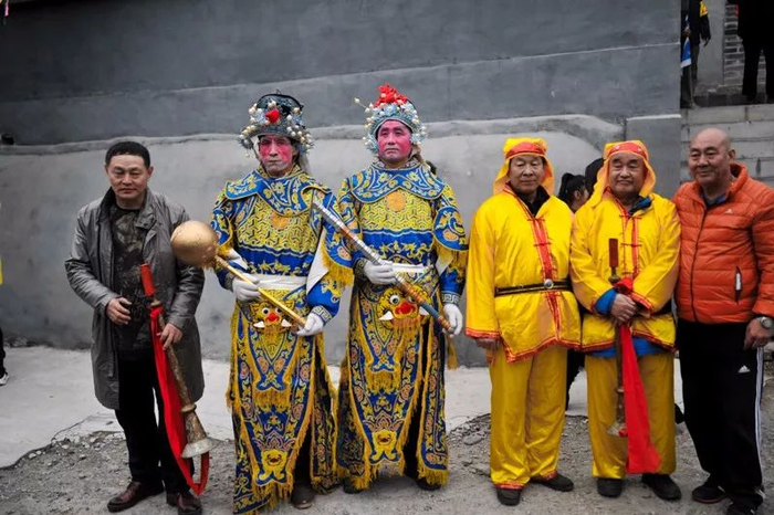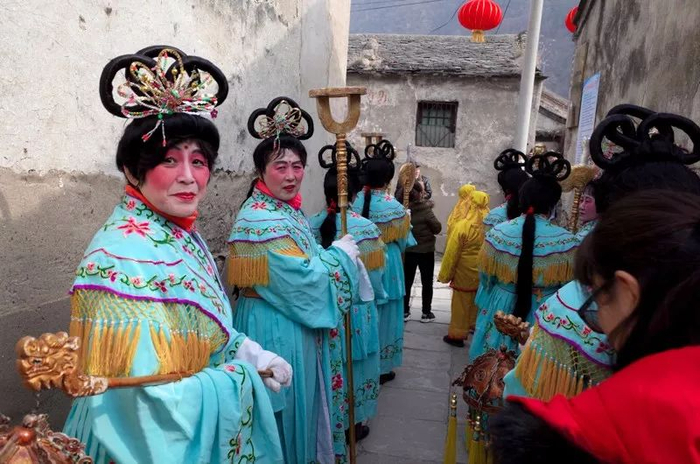 正月十五十六上午,村里会准备馒头炖菜和粥供全村人午饭,近年来随着外来游客的增多,炖菜改为咸菜,还是无偿供应给所有人。酒足饭饱之后,参会演员化妆着装,准备开始。