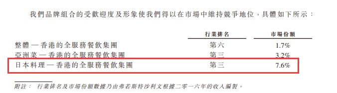 靠粤菜起家的叙福楼集团,如今其旗下的日本料理却更有竞争力,在香港餐饮市场占有率达7.6%,排名第三(注:2016年数据)。