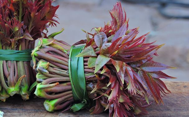 鲜嫩的香椿叶呈棕红色、不容易被拉扯掉,如果叶子是绿色的,而且一碰就掉,说明已经老了。