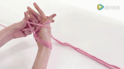 接着换右手拿毛线,同理,将毛线穿过左手毛线圈圈后,将毛线套在右手腕上。重复步骤四步骤五的动作,将毛线在左右手腕上反复交换,直到织成你想要的长度