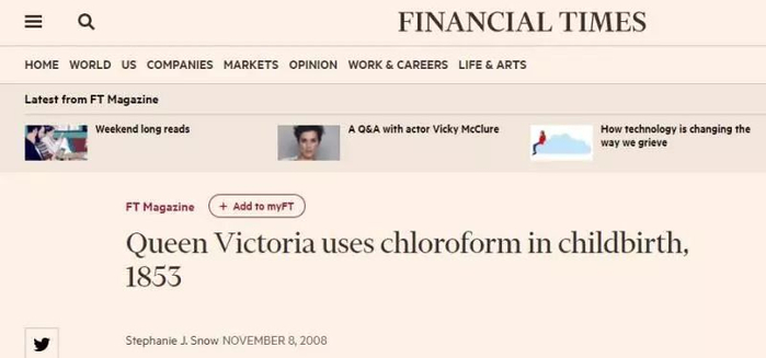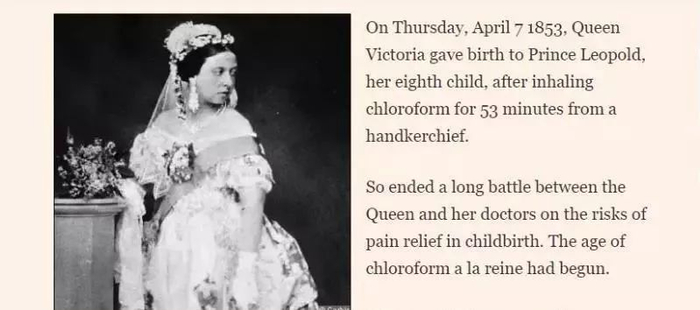据英国媒体《金融时报》,早在1853年,英国维多利亚女王在生下第八个孩子利奥波德王子的过程中,通过吸入依附在手帕中的(用作麻醉剂的)氯仿来实现减轻分娩痛苦。