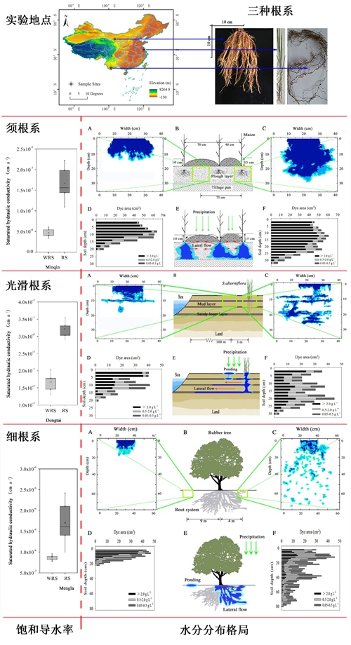 为定量评价不同形态特征的植物根系对土壤水分入渗运移行为的影响,中国科学院西双版纳热带植物园生态水文研究组助理研究员蒋小金、研究员刘文杰等选取橡胶树的细根系(云南省热带区)、互米花草的光滑根系(江苏省滩涂地)、玉米的须根系(甘肃省农耕地)为研究对象,采用染色示踪等方法对土壤导水率、水分运移行为和分布格局等进行了相关实验,并对入渗参数、土壤物理性质之间的关系做了冗余分析。结果表明,不同形态的根系对土壤物理性能和水分运移行为的影响不同。在农耕土壤中,玉米须根系使得土壤饱和导水率(Ks)、非毛管孔隙度(Øn)分别增加了252%、26%,水分在须根系诱导下优先渗入土壤,其后的足量水分储存在孔隙良好的耕作层中,为玉米生长用水提供了保障;在滩涂土壤中,容重高、导水率低的淤泥层阻挡了水分下渗、导致了大量地表径流,而在互米花草光滑根系生长处的土壤饱和导水率(Ks)、非毛管孔隙度(Øn)则分别增加了93%、92%,光滑根系轻易地穿透了淤泥层、诱导了水分的快速下渗、诱发了优先流和淤泥层间的侧流(层间高导水率的沙壤土所致),为水分(降雨)及时从海岸排放到海洋提供了保障。在热带土壤中,单作橡胶林的管理方式导致了土壤容重增加、雨水入渗缓慢,但在细根系处的土壤饱和导水率(Ks)、非毛管孔隙度(Øn)则分别增加了96%、234%,细根系诱导了雨水快速入渗到深层土壤、大量储存于土壤孔隙中,即细根系诱发的水分分布格局保障了橡胶树对土壤水分的及时需求。