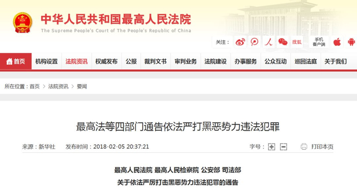 人民法院、最高人民检察院、公安部、司法部四部门联合发布《关于依法严厉打击黑恶势力违法犯罪的通告》。