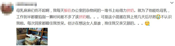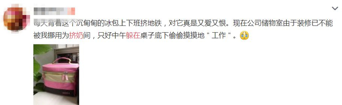 上海浦江海关的“新手”妈妈程敏同样面临着“背奶”的问题。她说,最夸张的就是看到过有“背奶妈妈”窝在公司的写字台下面,蹲在地上藏着挤奶。甚至有人在单位更衣室里挤奶,旁边就站着正在换衣服的同事。