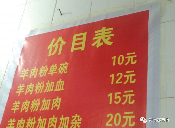 当天早上9时许,贵州都市报记者来到上海路一家羊肉粉店,刚进门,就看到门边的价目表上写着:羊肉粉单碗10元,加肉15元,加肉加杂20元。