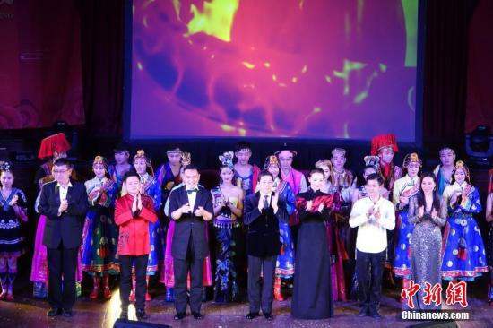 资料图:当地时间2月22日晚,2018“四海同春”欧洲团亮相英国剑桥市政厅,为当地侨胞们献上了一台充满中华文化魅力的艺术盛宴。图为演员集体谢幕。中新社记者 冉文娟 摄