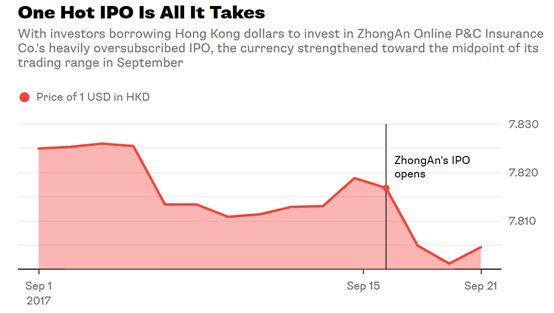彭博社指出,去年9月众安保险在香港上市,融资规模仅为15亿美元(约合117亿港元)左右。但是由于该股受到热捧,很多投资者为购入股份必须换购港元,港元兑美元汇率因此大幅上涨。