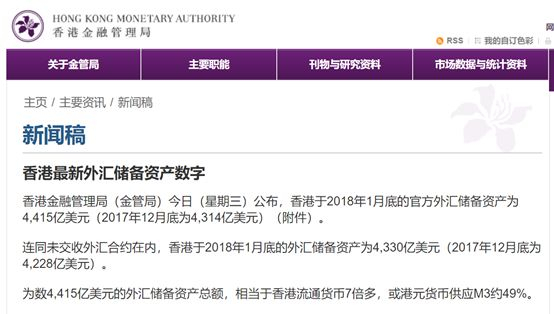 根据香港金管局最新公布的数字,截至2018年1月底,香港的外汇储备资产为4330亿美元,比去年12月底略有增加。外储规模相当于香港流通货币总量的7倍多。