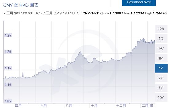 每经小编(微信号:nbdnews)注意到,在最近一年期间内,人民币兑港币的汇率从1.12的水平升至1.24,累计涨幅高达10.7%。
