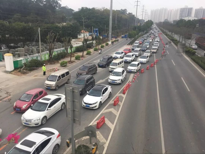 记者从交警部门了解到,为配合项目开工,3月1日晚10点秀厢大道鸡鸣路口至兴园路口已经进行了施工围挡,受围挡影响,今天早高峰从7点半左右开始,秀厢大道西往东方向通行压力非常大,后方队尾从大鸡村反堵到了北湖立交位置。流量地图显示,拥堵超过两公里。