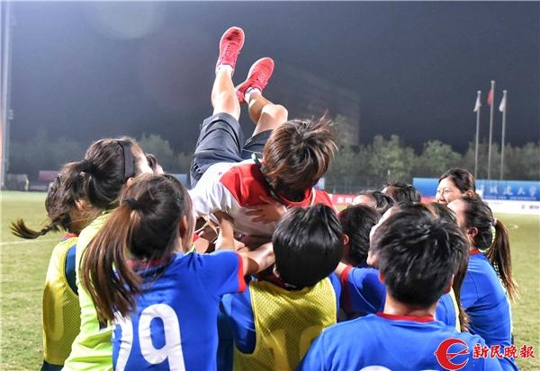 上海女足队员们兴奋地把水庆霞抛向空中。新民晚报记者 张龙 摄