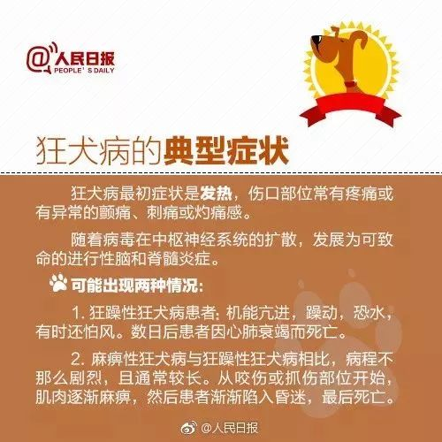 中国疾控中心官网科普信息显示:“狂犬病又叫疯狗病或恐水症,是由狂犬病病毒导致的人兽共患急性传染病,和其它很多传染病相比,狂犬病的潜伏期相对较长,长可达数月,但也可短为数天。狂犬病主要影响中枢神经系统,人得了狂犬病后的特征性临床一般表现为恐水、畏光、吞咽困难、狂躁等,最后死于呼吸、循环和全身衰竭。”