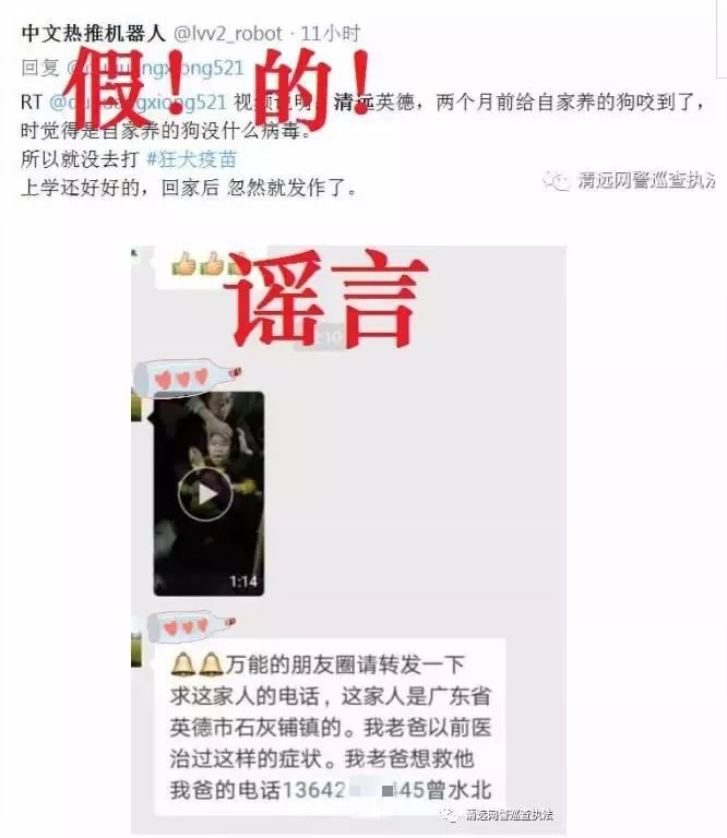 热传视频声称英德地区一男孩被自家养的狗咬到了,当时没有打疫苗导致发作,发现这一情况后,英德市网警支队迅速向英德市相关防疫部门了解情况,得到回复是近期并未接到狂犬病事发报告,该信息和视频属造谣。