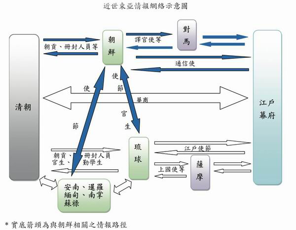相比而言,位于中日之间的朝鲜收集各国情报就方便许多。朝鲜自建国以来,就开始向明朝派遣正朝使、冬至使、圣节使等外交使节。这些使臣的派遣除了维持事大关系外,也是朝鲜王朝收集中国政治、军事等各方面情报的重要方式。具体来说,一是直接通过《钦定礼部则例》的记载,二是购买中国书籍、文献、报刊,三是与沿路的中国知识分子交谈。另外,北京是当时东亚和东南亚各国交流和情报收集的重要据点,朝鲜使节借与暹罗等国使节相遇的机会,利用笔谈或者询问其使团中通晓汉文的使者来收集东南亚情报。日本情报方面朝鲜主要通过向日本派遣通信使、向对马派遣问慰行(日方称为译官使)亲自收集,或者间接通过可以进出釜山草梁倭馆的倭学译官(朝鲜王朝的日语翻译)收集。
