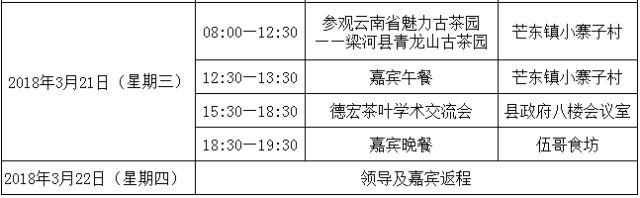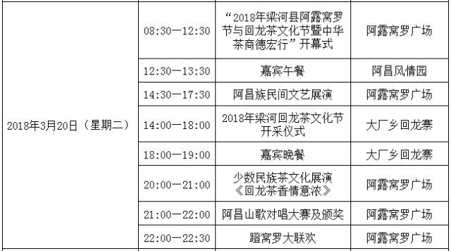 此次活动主题为“相约孔雀之乡,体验阿昌文化,品味德宏茶韵,推动德宏茶产业快速发展,助推德宏脱贫攻坚”。届时,活动将举行阿露窝罗节与回龙茶文化节暨中华茶商德宏行开幕式,梁河回龙茶开采仪式,德宏茶及梁河农特产品展销会,迎宾茶叙活动,参观梁河魅力古茶园,德宏茶叶学术交流会。