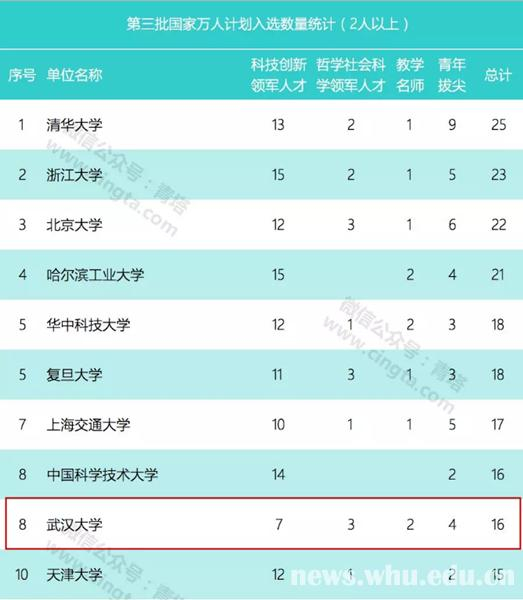 新闻网讯(记者陈丽霞)中共中央组织部办公厅日前下发《关于印发第三批国家“万人计划”入选人员名单的通知》,武汉大学共入选16人,位列全国第八,包括7名科技创新领军人才、3名哲学社科领军人才、2名教学名师和4名青年拔尖人才。