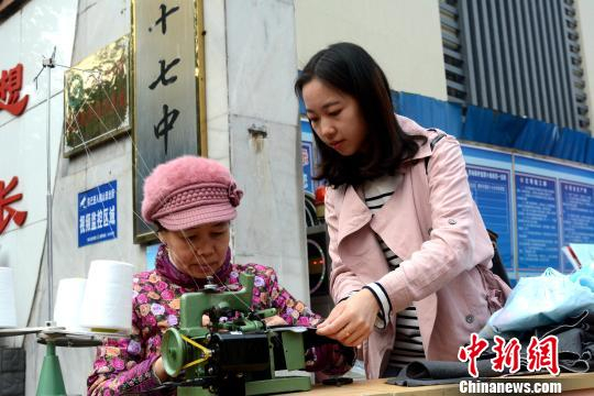 3月10日,广西柳州机车车辆厂的一对母女韦美京和池婷婷为市民提供免费衣物锁边服务。 孙赟飞 摄