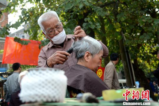 3月10日,75岁的志愿者韦天华正在市民提供免费理发服务。 孙赟飞 摄