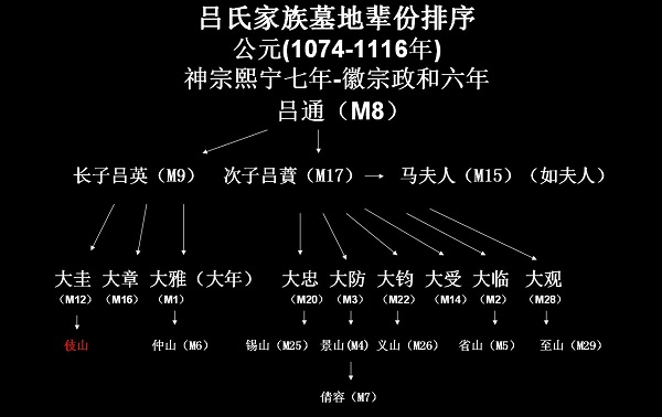 北宋吕氏墓园使用时间为宋神宗熙宁七年(1074年)至宋徽宗政和六年(1116年),共计42年,埋葬了五代吕氏族人。根据发掘出土的吕氏家族墓志铭,可基本排列出葬于祖茔中的北宋中晚期家族成员谱系表,详见(图八)。