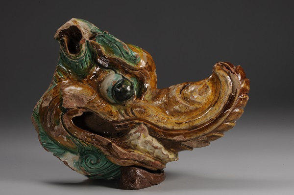 吕氏家庙原名已失,最早的建筑与墓地同期完成,现存的家庙主体建筑为北宋晚期,乃五开间式高台殿堂。曾经有着阔顶高墙、彩绘雕栏。但近一千年的风雨苍桑已经吞噬了这一切,只有废墟中的青砖黛瓦、龙纹滴水、兽面瓦当、三彩脊兽(图六)依然尽显昔日建筑的庄严肃穆、高大气派。