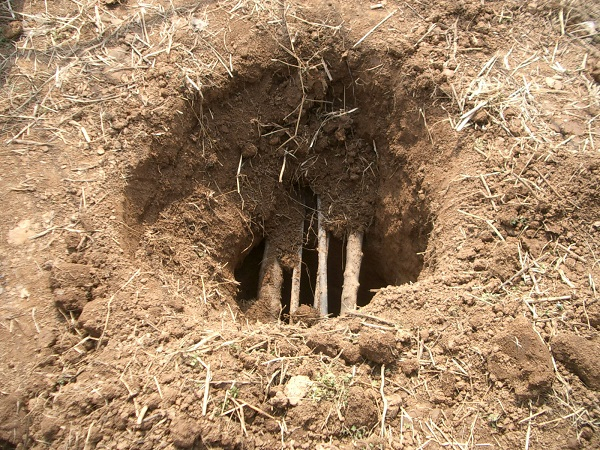第二天,一个习惯早起的老人,踏着晨霜走在田间小路上,突然路旁的桃树林中一堆澪乱蓬松的枯草引起了他的注意,自己常在这条路上经过,怎么以前没看到这堆草呢?处于好奇,老汉走上前一把撩开草堆,眼前的景象让他瞪大了眼睛半天说不出话来,他究竟看见了什么呢?原来那草堆下,隐藏着一个惊人的密秘!一个直径约六十厘米左右的土洞象一只怪兽般张着深不见底的大嘴直对着他(图二)。老人惊出一身冷汗,连忙后退几步才站住脚跟,好一阵心中才平静下来,谁吃饱了撑的大冬天在野地里挖窟窿!想想,不对呀,这洞来的好奇怪,一定有事。再仔细查看周围,忽然想起,这地方不是吕家的坟地吗?