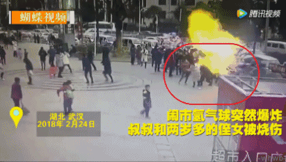 武汉街头,小贩手中的氢气球突然爆炸,火苗足足窜出三四米高!导致一名年轻男子、一名两岁的小女孩受伤。