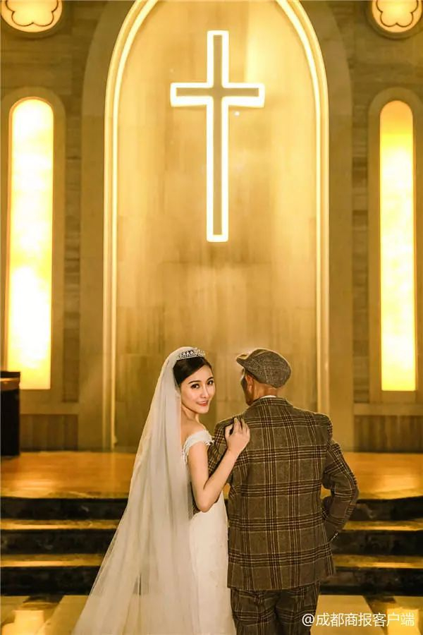 照片上,符雪薇洁白的长裙拖地,头纱飘逸,只是身边身着西装、拄着拐杖的背影有些佝偻。