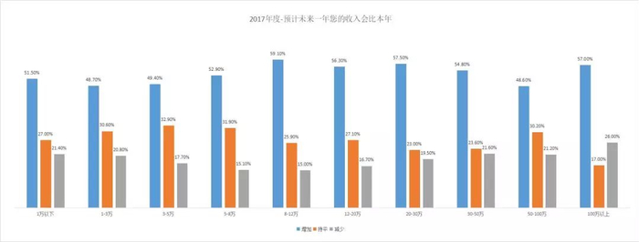 大调查发现,收入高的人群其实信心还不是最强的。个人年收入在8-12万、12-20万和20-30万这三个中等收入群体,收入预期相对普遍较高,分别占比59.10%、56.30%、57.50%。而年收入1万以下的低收入人群预期也不低(51.50%)。