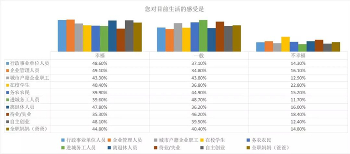 大调查还发现,在不同职业中,企业管理人员、行政事业人员、创业者的幸福感相对最高。