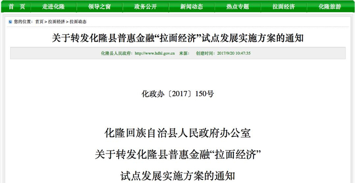 2017年9月,化隆县还出台了《化隆县普惠金融“拉面经济”试点发展实施方案》。方案显示,