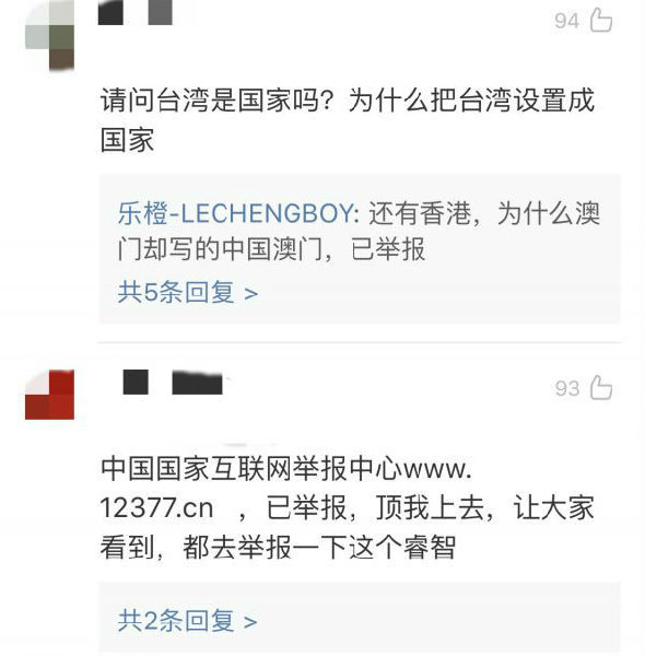 “中国台湾”被改回“台湾”,“中国香港”也只剩下“香港”两字