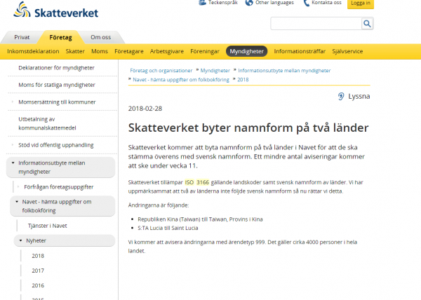 例如上月底瑞典税务局发公告宣布:因不具备相匹配的ISO国家代码,因此将从第11周开始把台湾的称呼改为“台湾,中国的一省”。