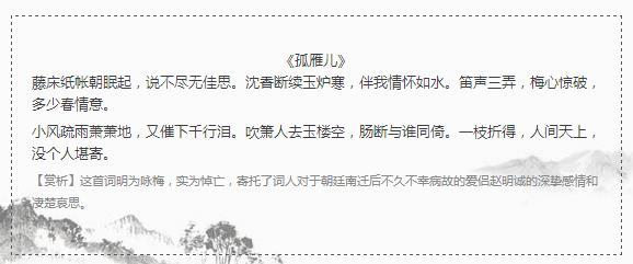 但这一切的美好,却宛如那个远去的春天,让人慨叹且怀念。北宋灭亡,她所有的幸福,也被这无情的现实击得粉碎。她生命的后三十年,只剩下了难言的苦楚与凄凉。祖国破碎,丈夫骤逝,她在颠沛流离中尝尽了孤独况味。