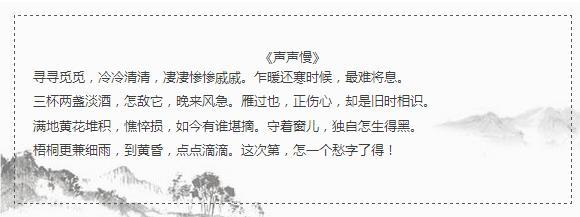 渐入暮年的李清照没有孩子,守着一孤清的小院落,亡国之恨,丧夫之哀,孀居之苦,凝集心头,无法排遣。她收集的文物汗牛充栋,她学富五车,词动京华,却情无所托、学无所传。晚年的她,在杭州深秋的落叶黄花中,吟出这首浓缩了她一生和全身心痛楚的,也确立了她在中国文学史上地位的《声声慢》。