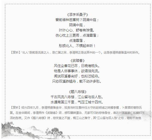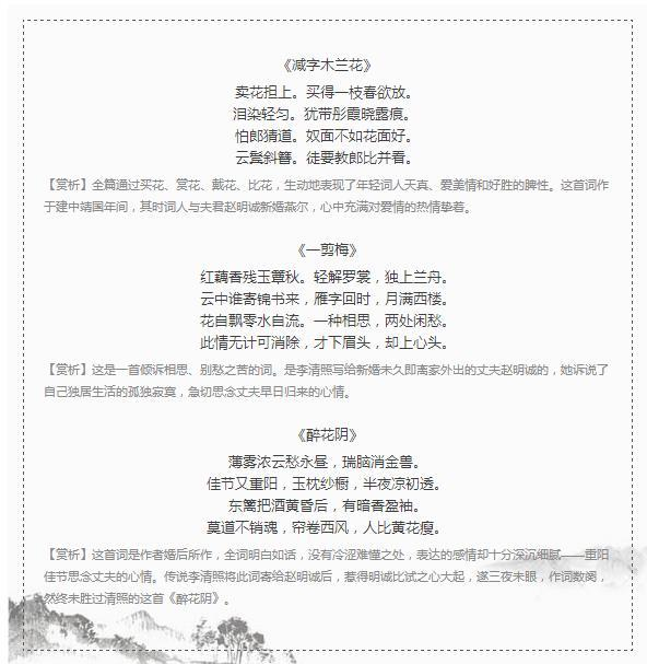 李清照流传下来的词作很少,但从那些精致的文字中,我们依旧可以看到她天真的笑影,看到她眉弯的浅愁,看那些曾经的优柔岁月随风飘逝。而她的那些怀念与倾诉,也终被每一个喜爱她人格与词作的人们所铭记于心。